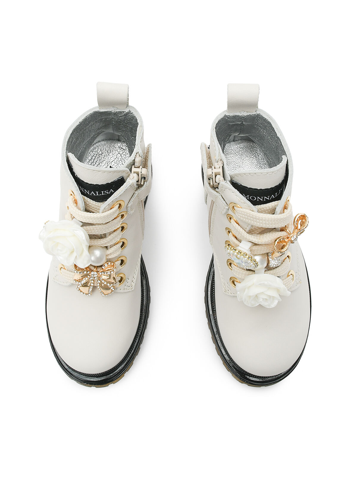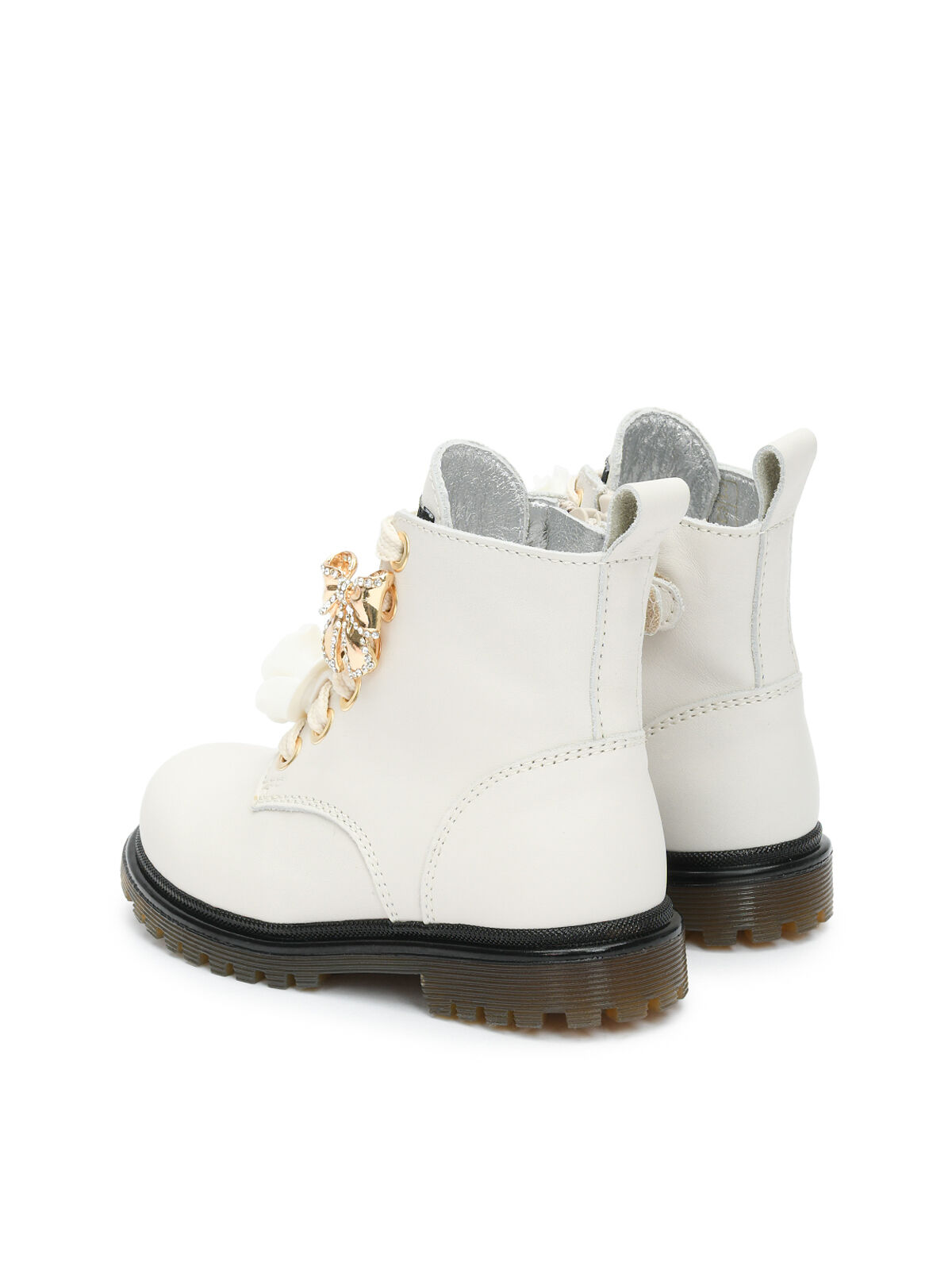 Высокие белые ботинки Monnalisa выполнены из натуральной гладкой кожи. Модель с застежкой на боковую молнию дополнена петелькой на заднике. Шнурки декорированы вставками с крупными кристаллами, перламутровыми бусинами и 3D розой. Серебристые подкладка и стелька из кожи обеспечивают дополнительный комфорт. Рифленая подошва из эластодиена отлично амортизирует стопу во время ходьбы.