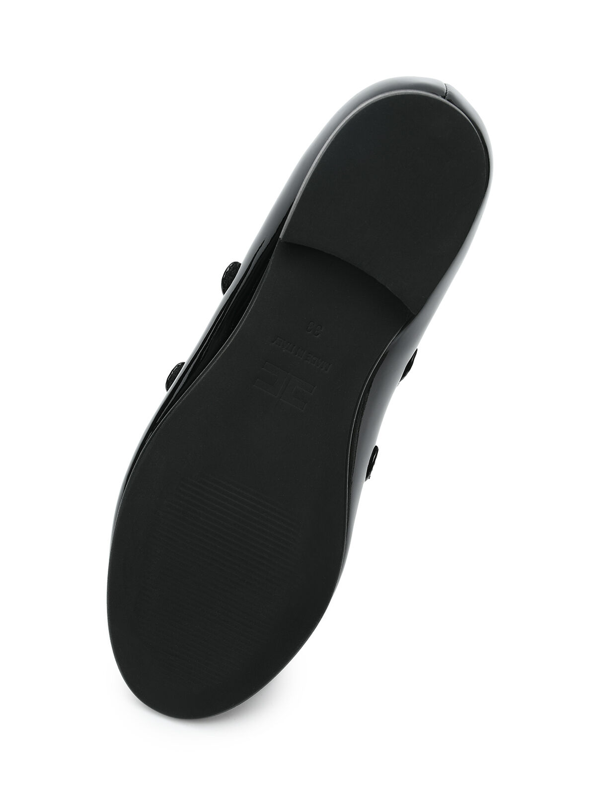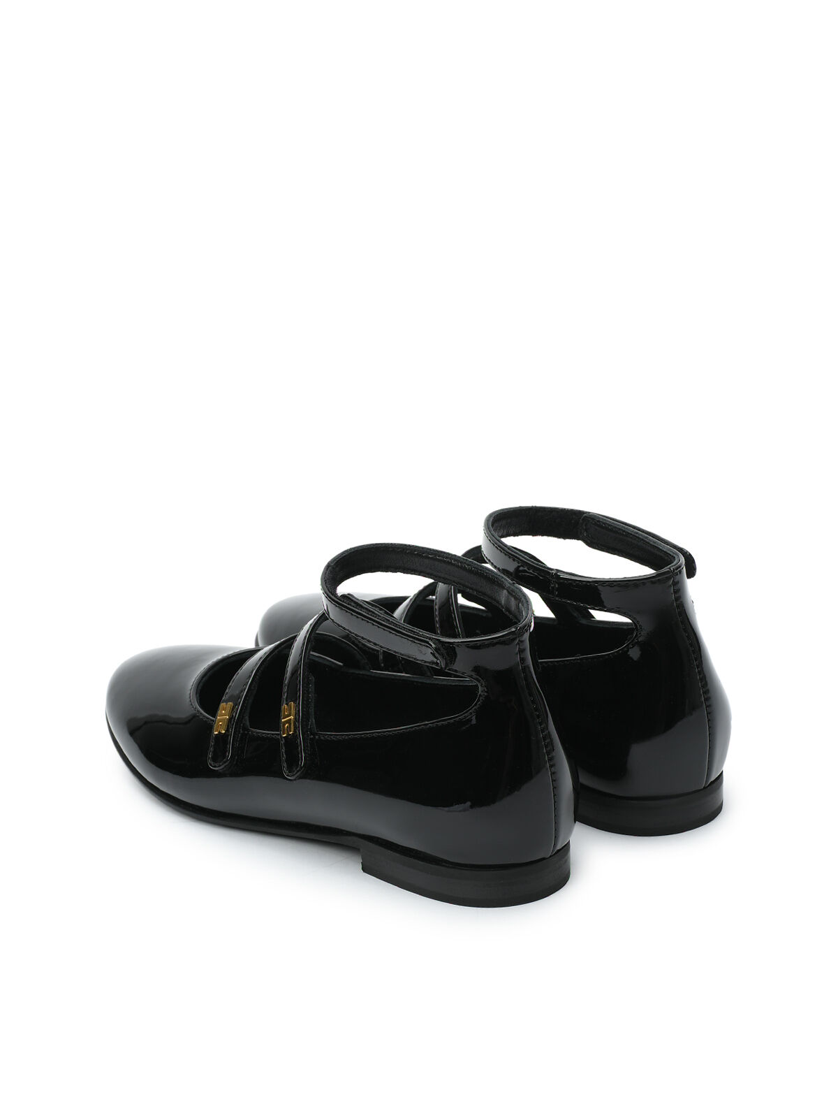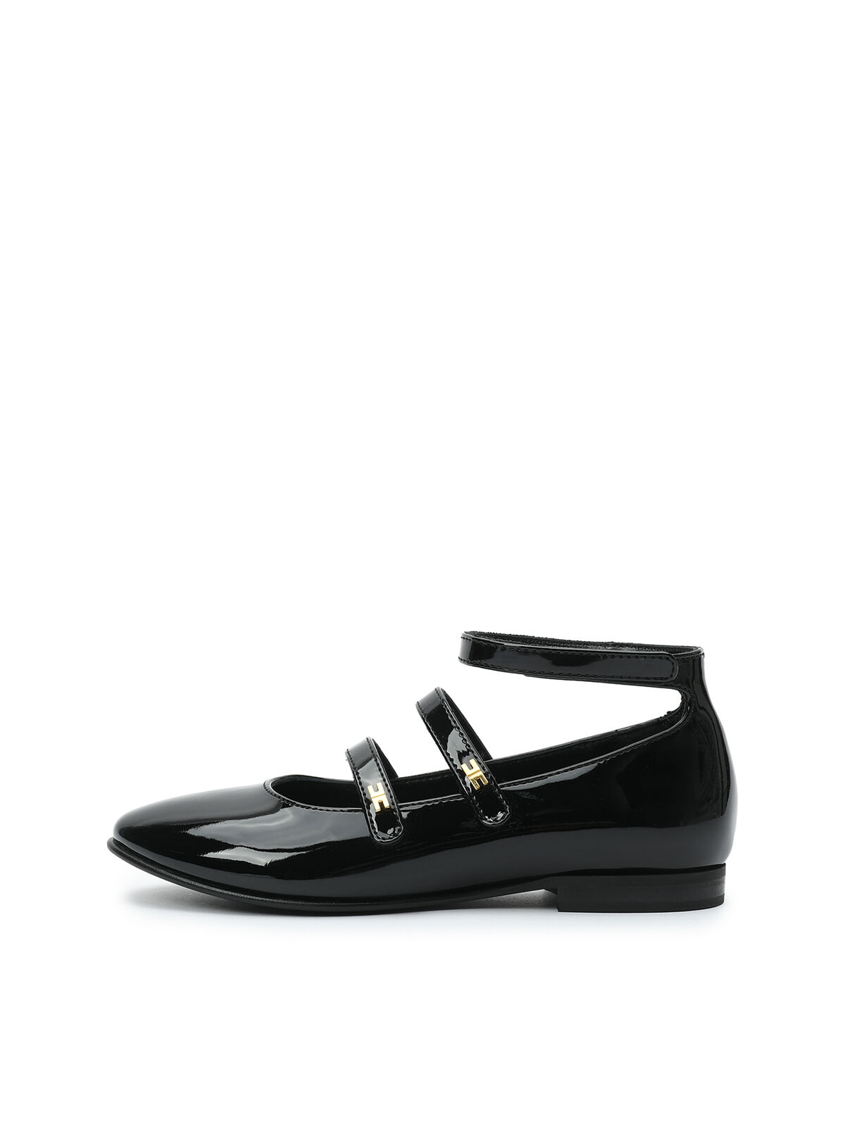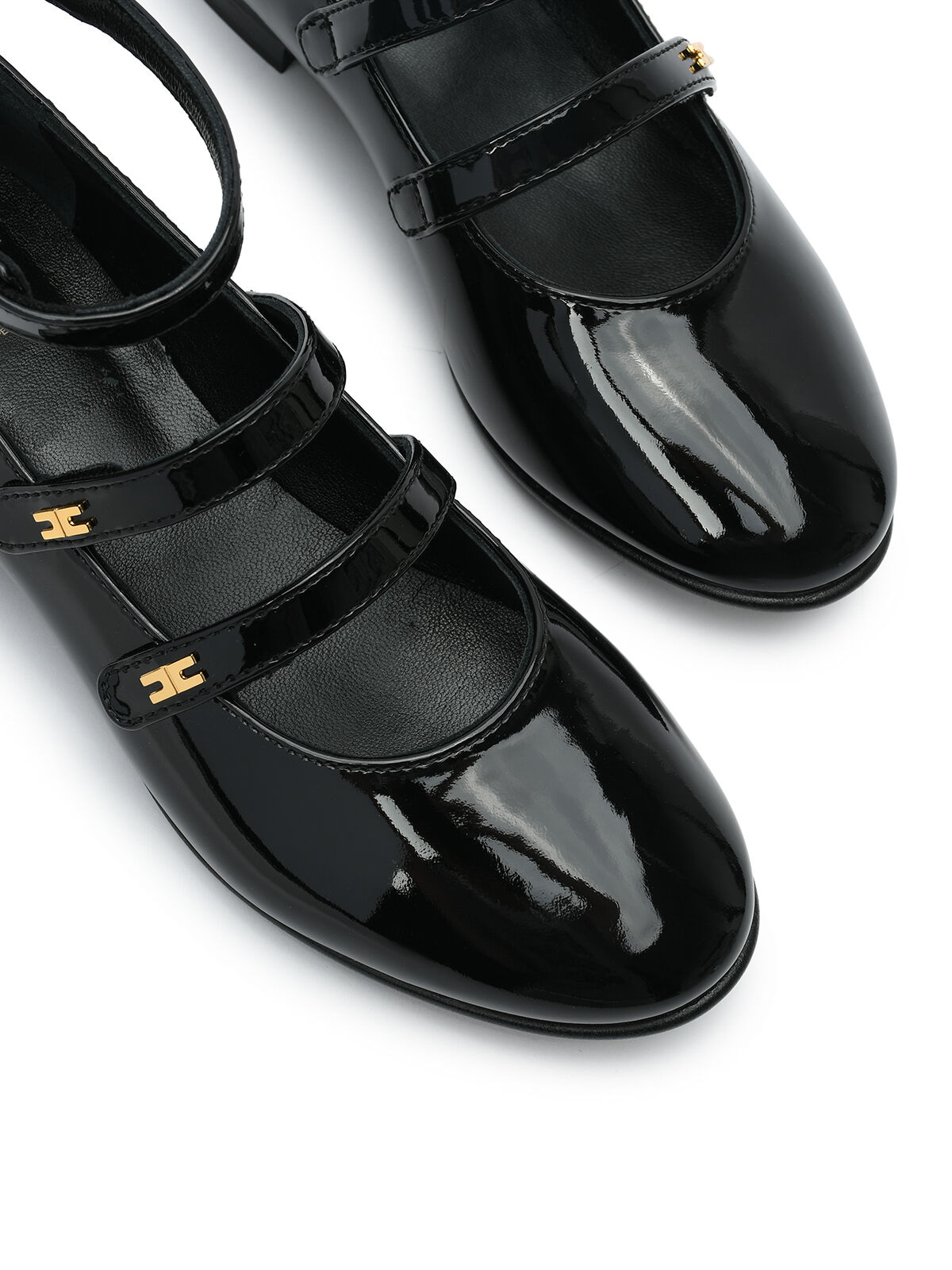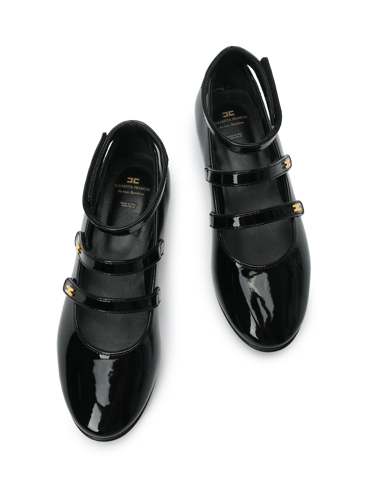 Черные туфли Elisabetta Franchi из лаковой кожи в классическом черном цвете. Три узких ремешка позволяют отрегулировать комфортную посадку и при этом добавляют модели модный штрих. Кожаная подкладка обеспечивает идеальный микроклимат внутри обуви. Резиновая подошва дополнена небольшим каблуком. Изделие декорировано золотистыми накладками в виде монограммы бренда.