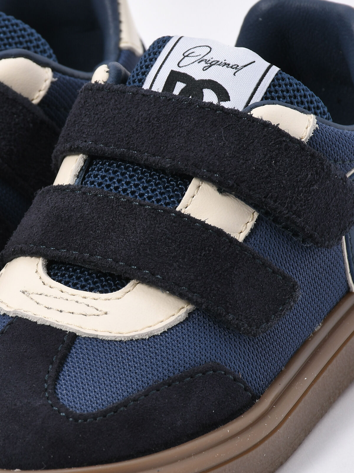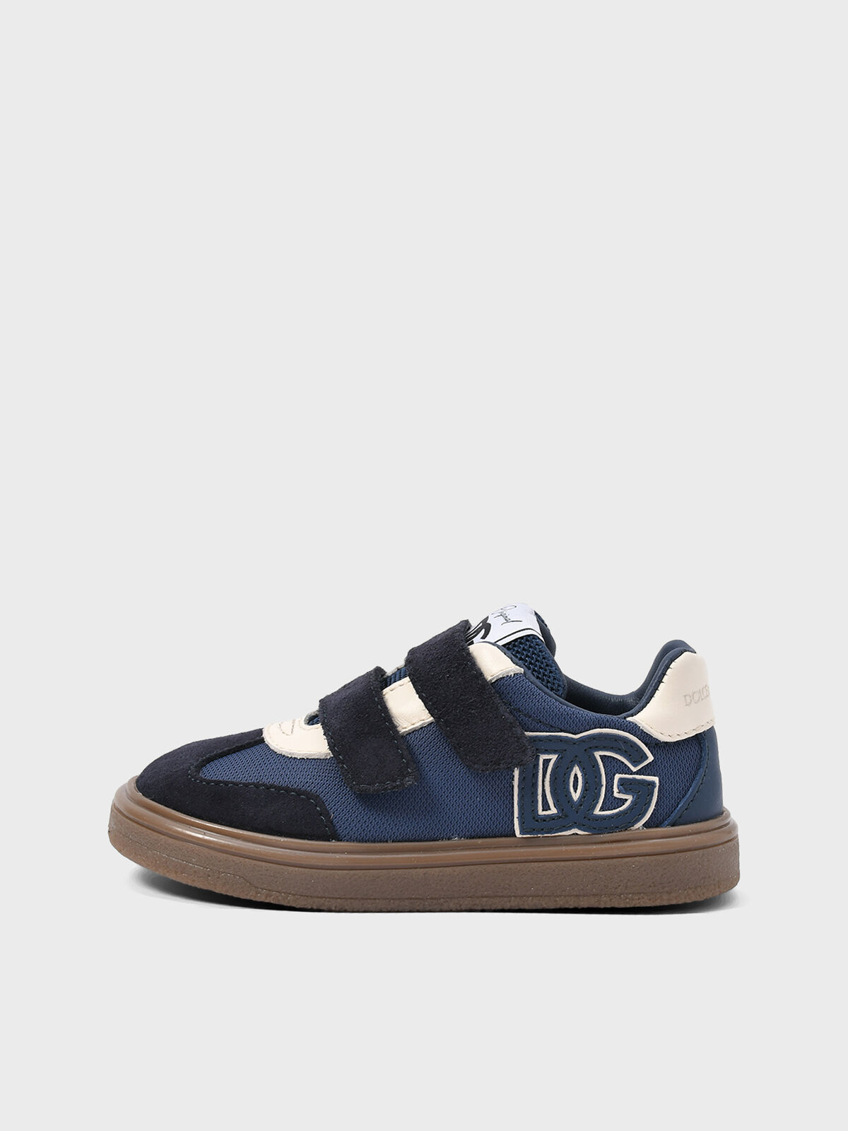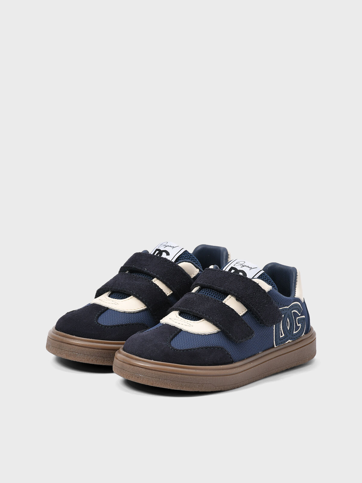 Кеды синего цвета выполнены из высококачественных материалов. Модель на объемной коричневой подошве и двумя регулируемыми ремешками велкро вместо шнуровки украшена монограммой бренда в тон.