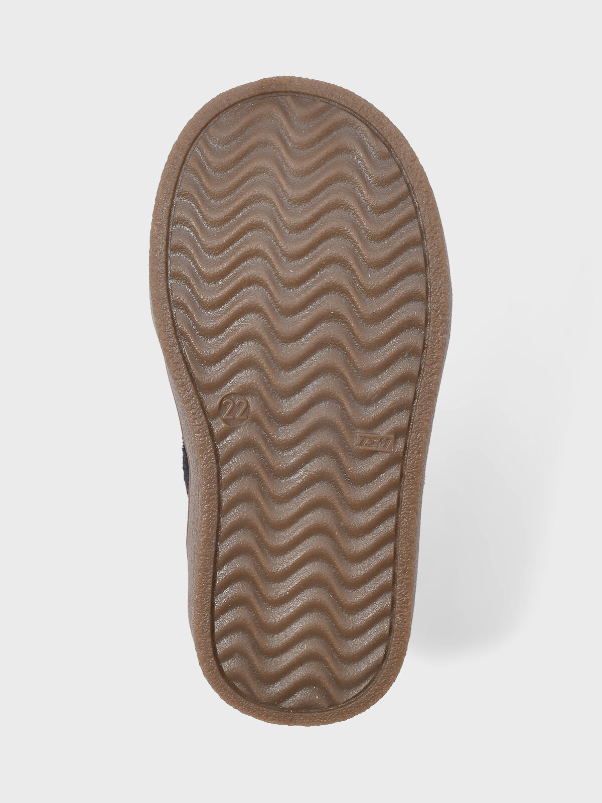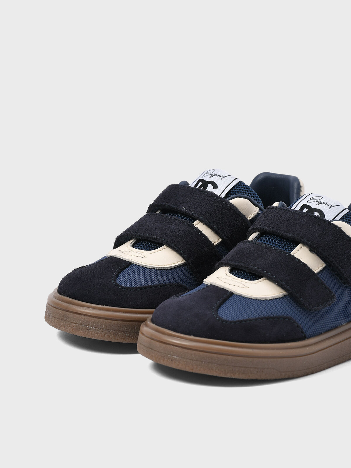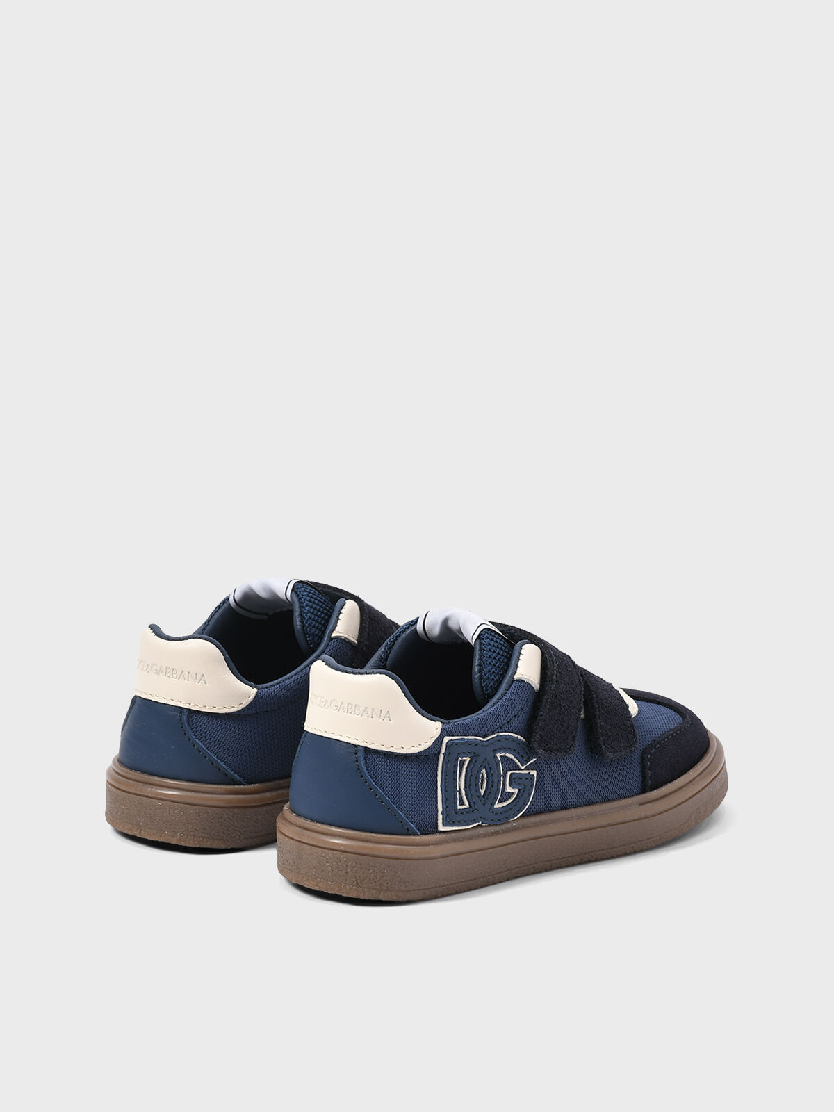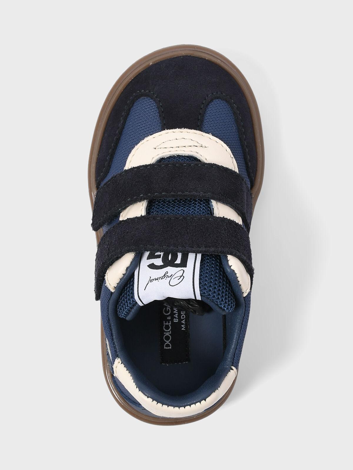 Кеды синего цвета выполнены из высококачественных материалов. Модель на объемной коричневой подошве и двумя регулируемыми ремешками велкро вместо шнуровки украшена монограммой бренда в тон.
