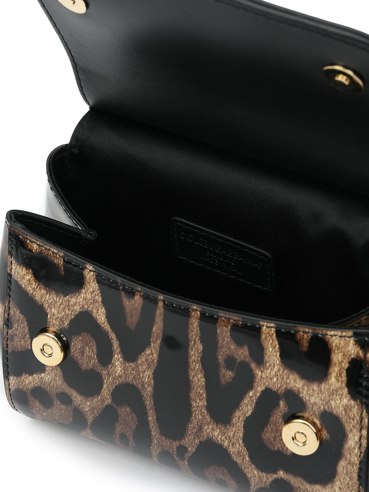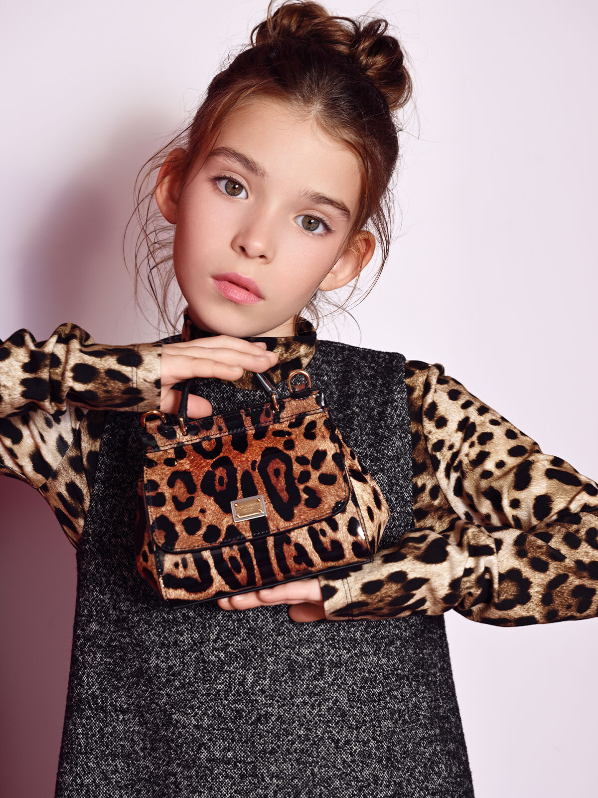 Миниатюрная сумка из натуральной кожи — как секретный дневник маленькой иконы стиля. Леопардовый принт и табличка Dolce & Gabbana оттенка шампанского превращают её в аксессуар для сказочных походов с мамой в кафе или музеи. Продуманный формат для первых «своих» вещей.