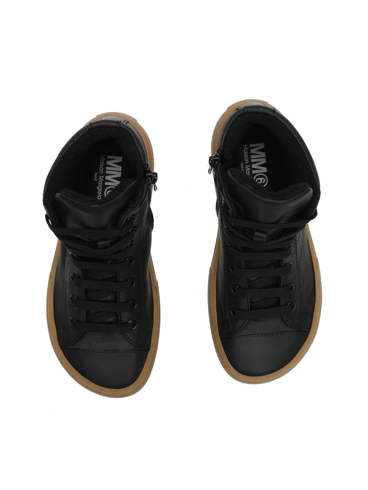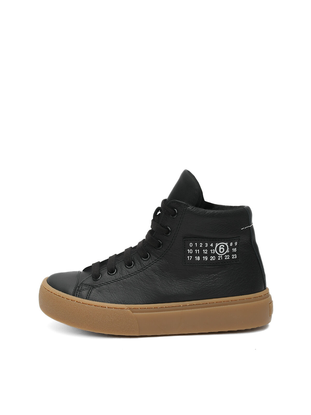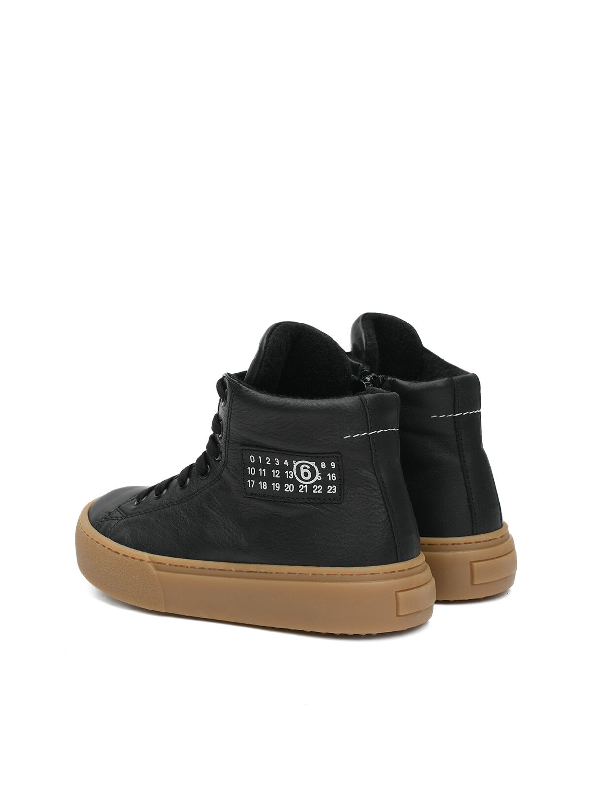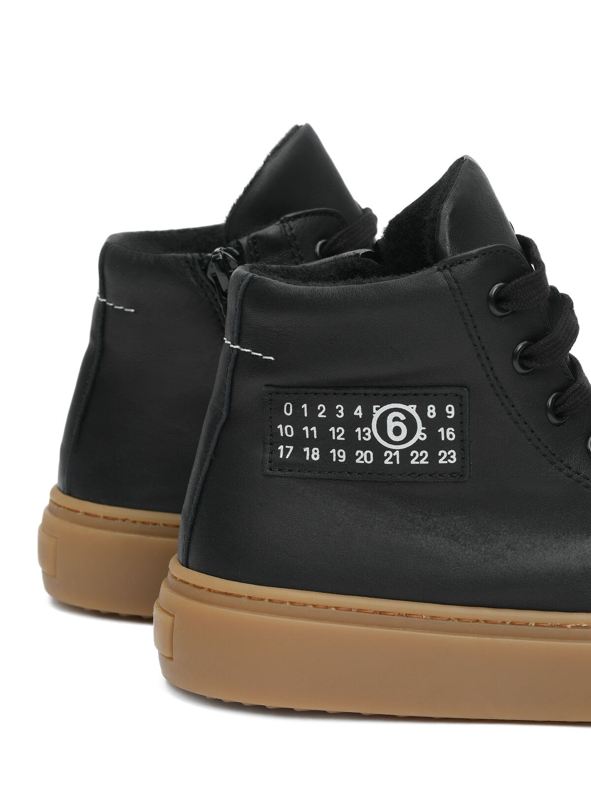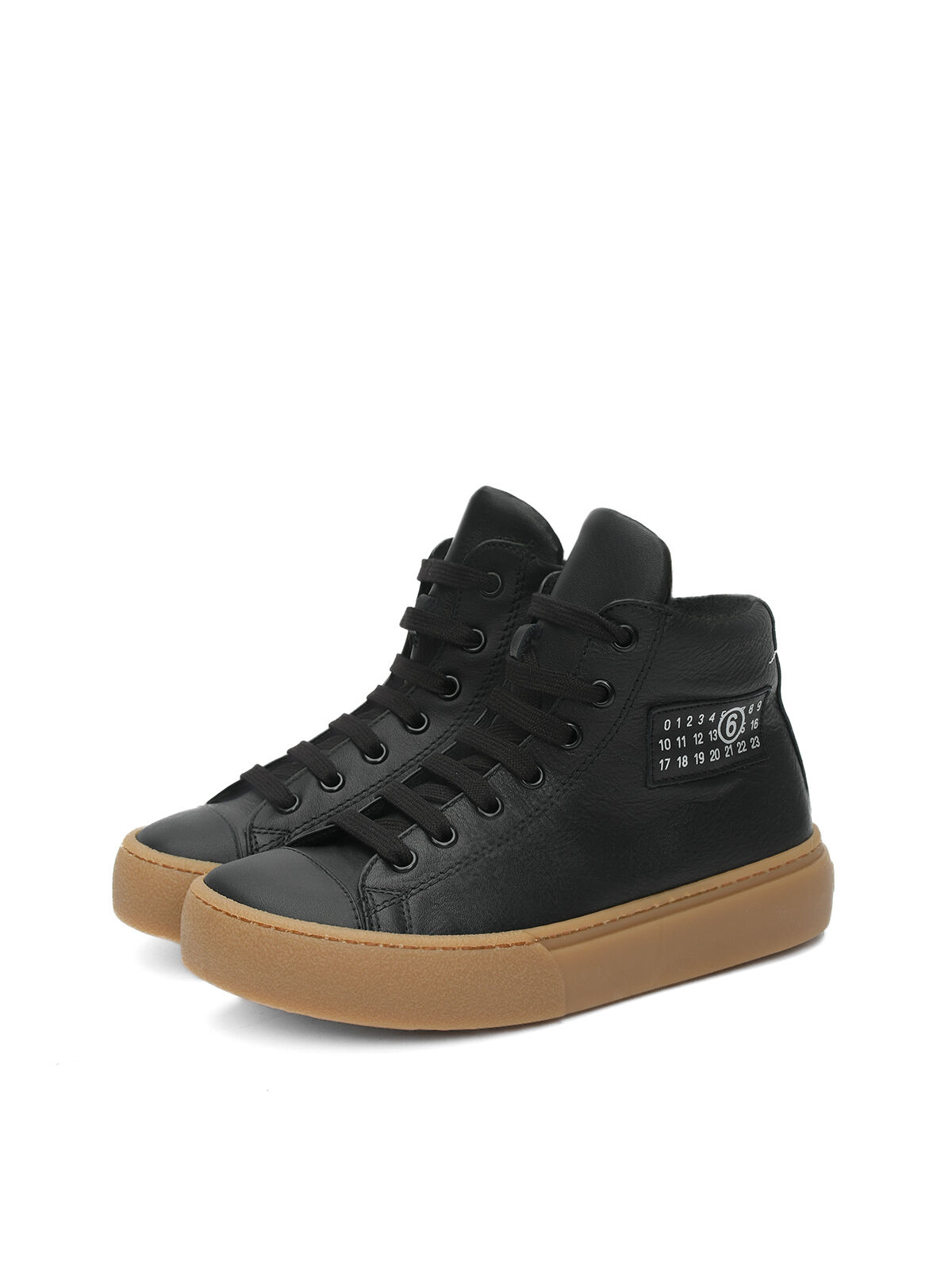 Высокие кеды Maison Margiela для девочек выполнены в универсальном черном цвете с белым логотипом сбоку, который подчеркивает идентичность марки. Натуральная кожа обеспечивает мягкость и долговечность. Благодаря удобной шнуровке, изделие легко регулируется по ширине стопы. Внутренняя подкладка и стелька изготовлены из 100% полиэстера, что способствует циркуляции воздуха и комфорту в течение всего дня. Подошва бежевого цвета выполнена из термопластичной резины, она устойчива, гибкая и хорошо амортизирует при ходьбе.