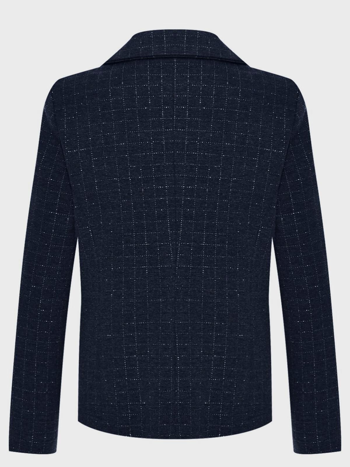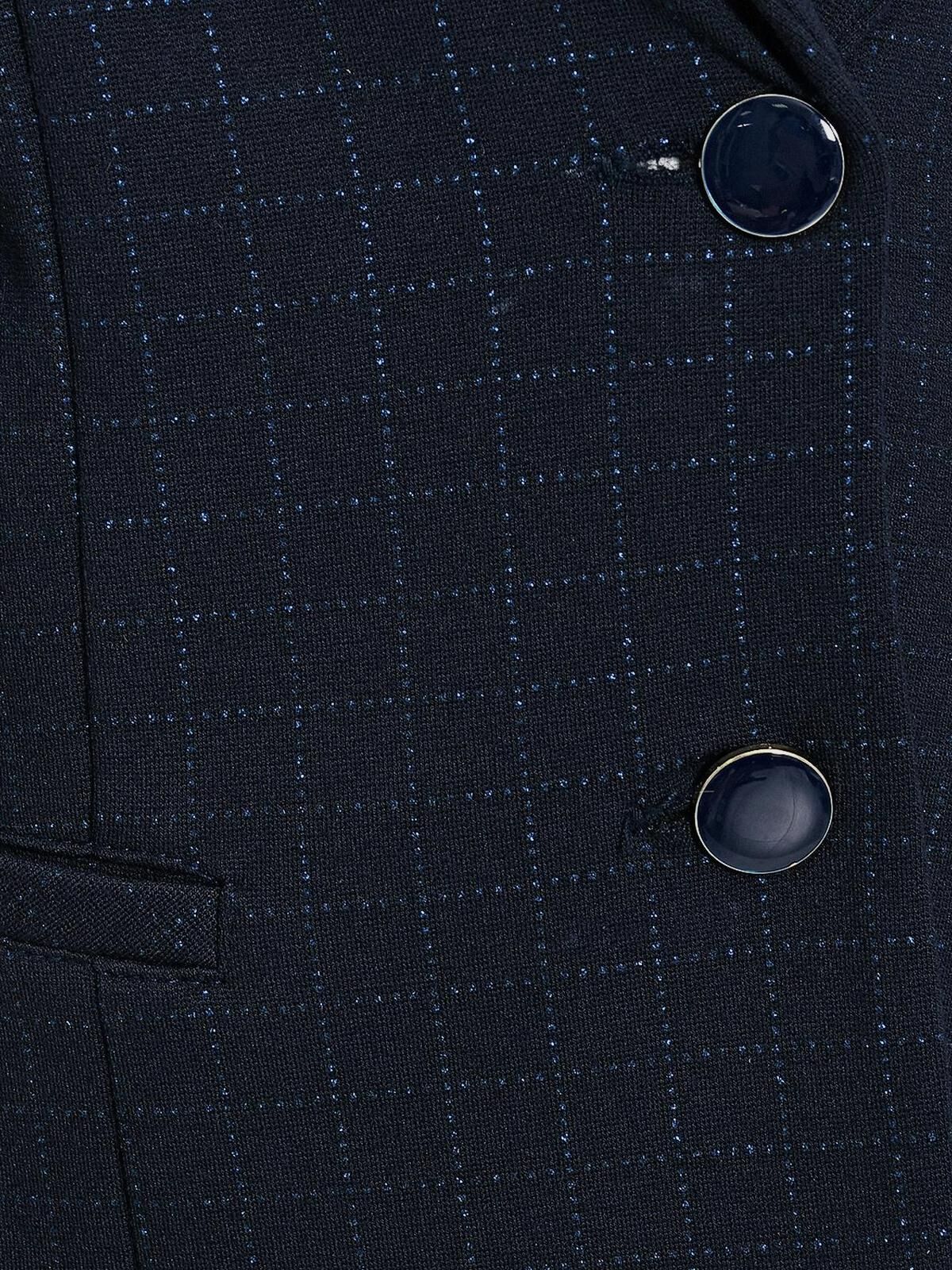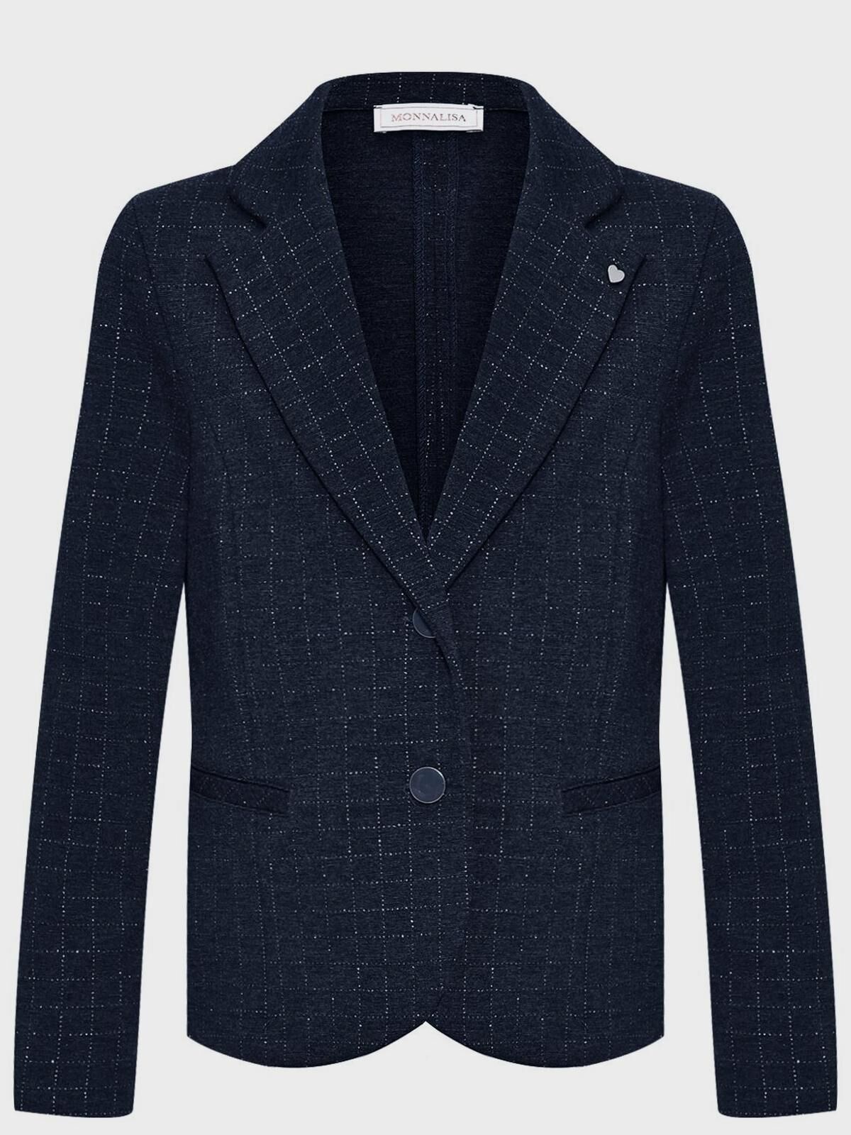 Пиджак в клетку с люрексом выполнен из плотного немнущегося трикотажа на основе вискозы синего цвета. Прямая однобортная модель с прорезными карманами идеально сидит на фигуре. Этот пиджак станет отличным выбором для создания элегантных школьных образов, позволяя выглядеть стильно и уверенно каждый день.