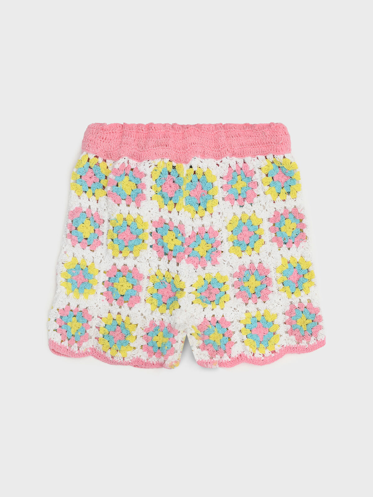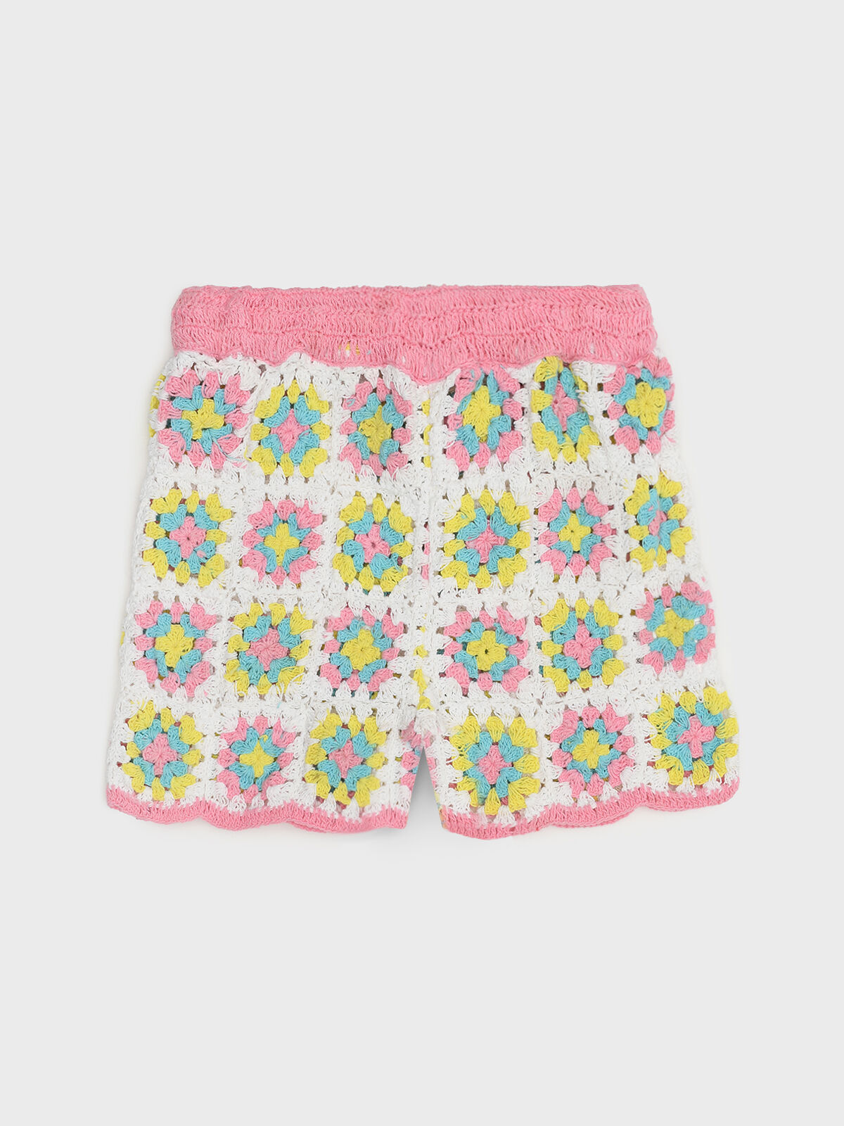Эти шорты будто связаны из самого лета: мягкая хлопковая пряжа, воздушная ажурная вязка и палитра, как коробка пастельных мелков. Розовый пояс добавляет нежный акцент, а лёгкая посадка делает их удобными и для пляжного дня, и для игр во дворе с подругами. Настроение: солнце, ветер в волосах и любимая жвачка.