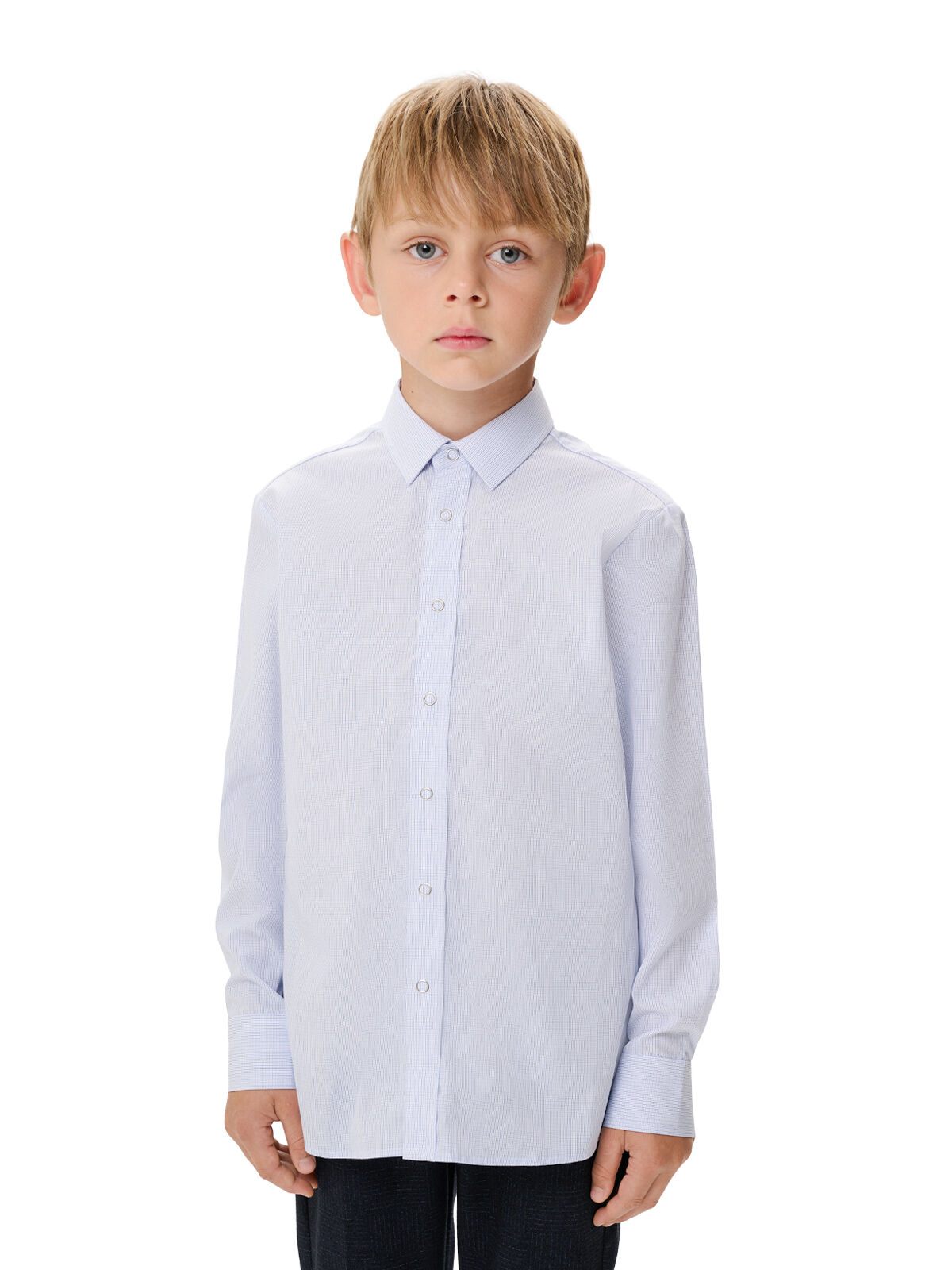 Голубая рубашка KengLabel выполнена из гладкого шелковистого хлопка. Модель прямого кроя с длинными рукавами и классическим воротником застегивается на кнопки. Принт в мелкую клетку придает изделию стильный, но сдержанный вид, делая ее уместной как для повседневных занятий, так и для школьных мероприятий.