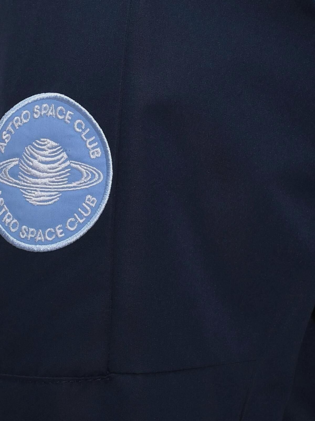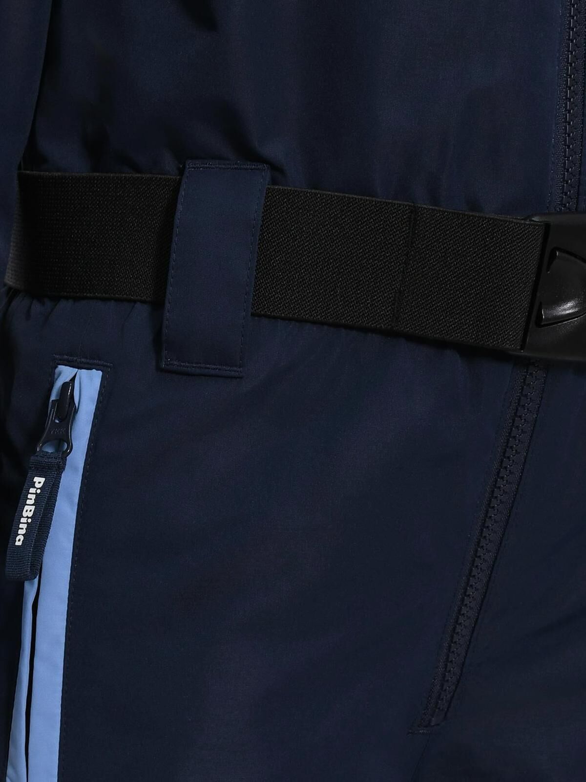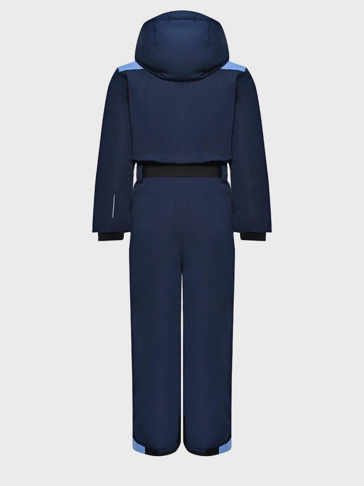 Синий комбинезон изготовлен из водооталкивающего полиэстера. Модель с боковыми карманами и глубоким капюшоном застегивается на кнопки и молнию в тон. Рукава-реглан дополнены эластичными манжетами. Широкий черный пояс позволяет комфортно фиксировать посадку.