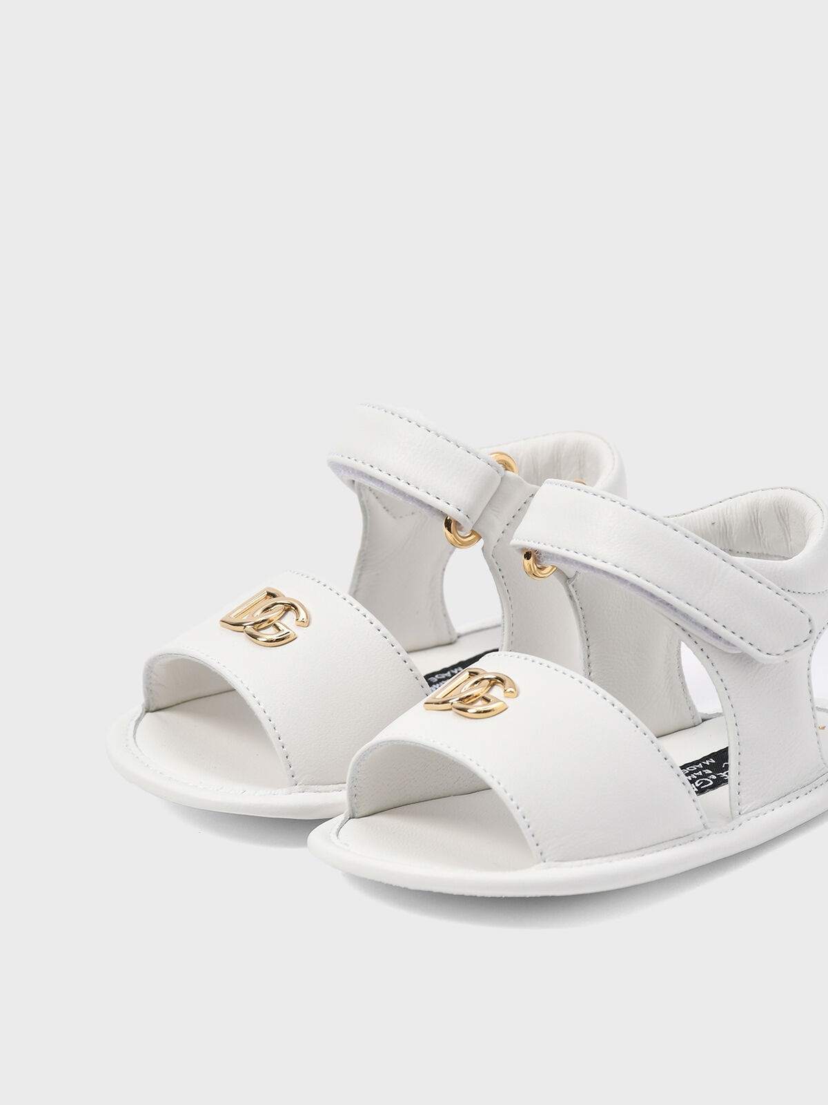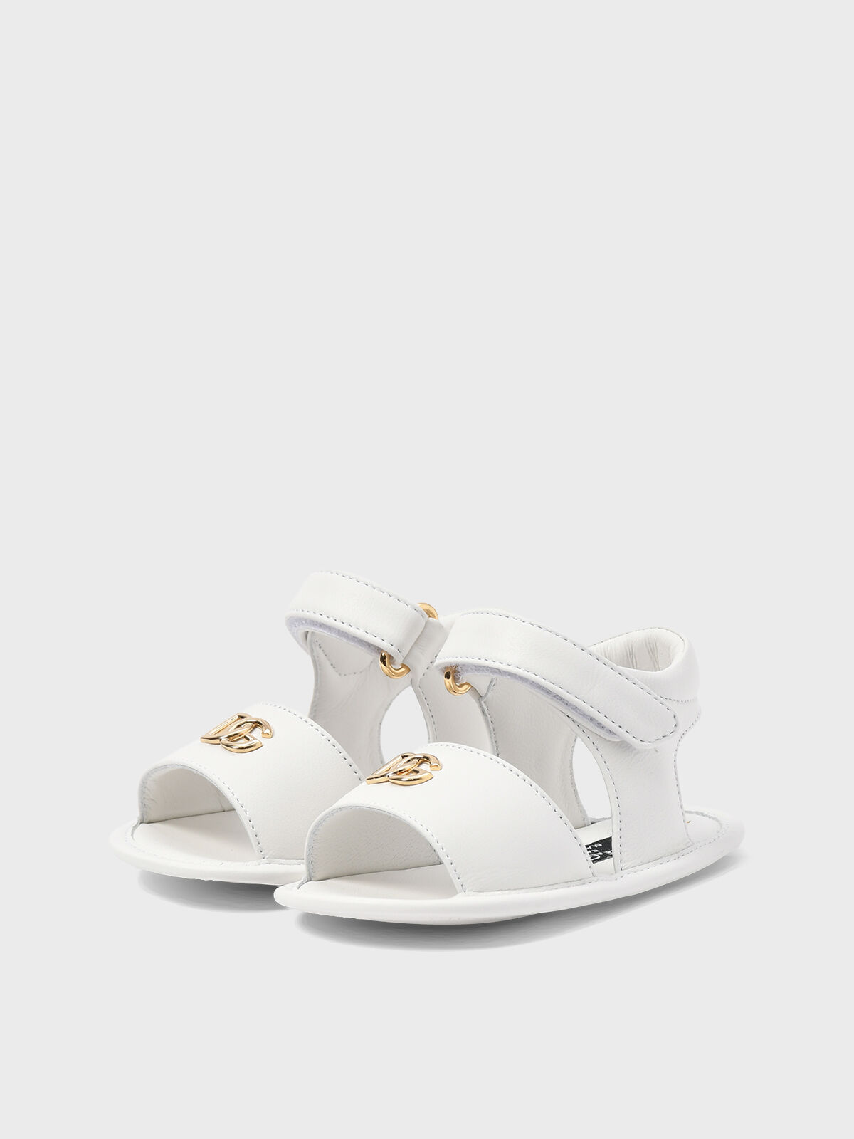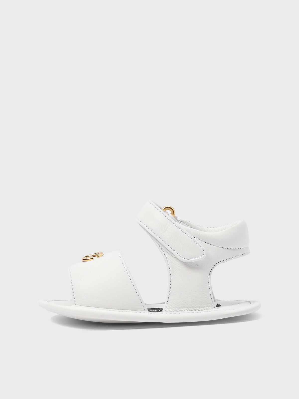Пинетки-босоножки для новорожденных выполнены из мягкой белой кожи премиум-класса. Модель оснащена удобной застежкой на липучке, которая позволяет плотно зафиксировать обувь на ноге. Пинетки декорированы золотистой монограммой бренда.