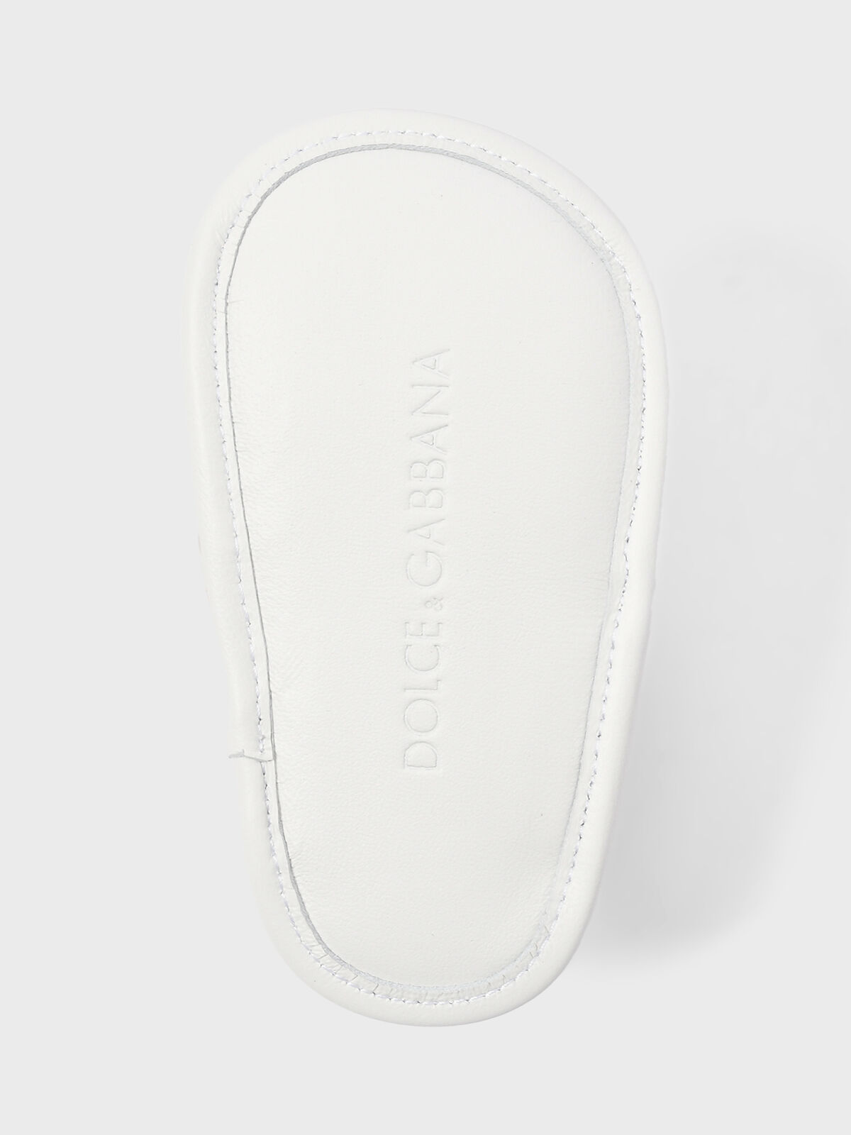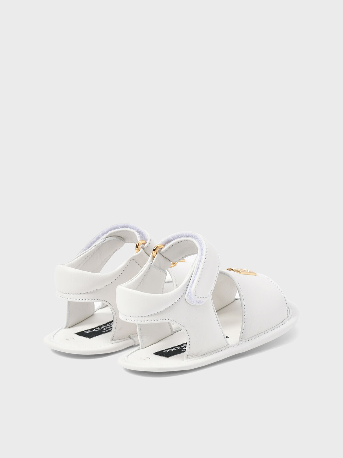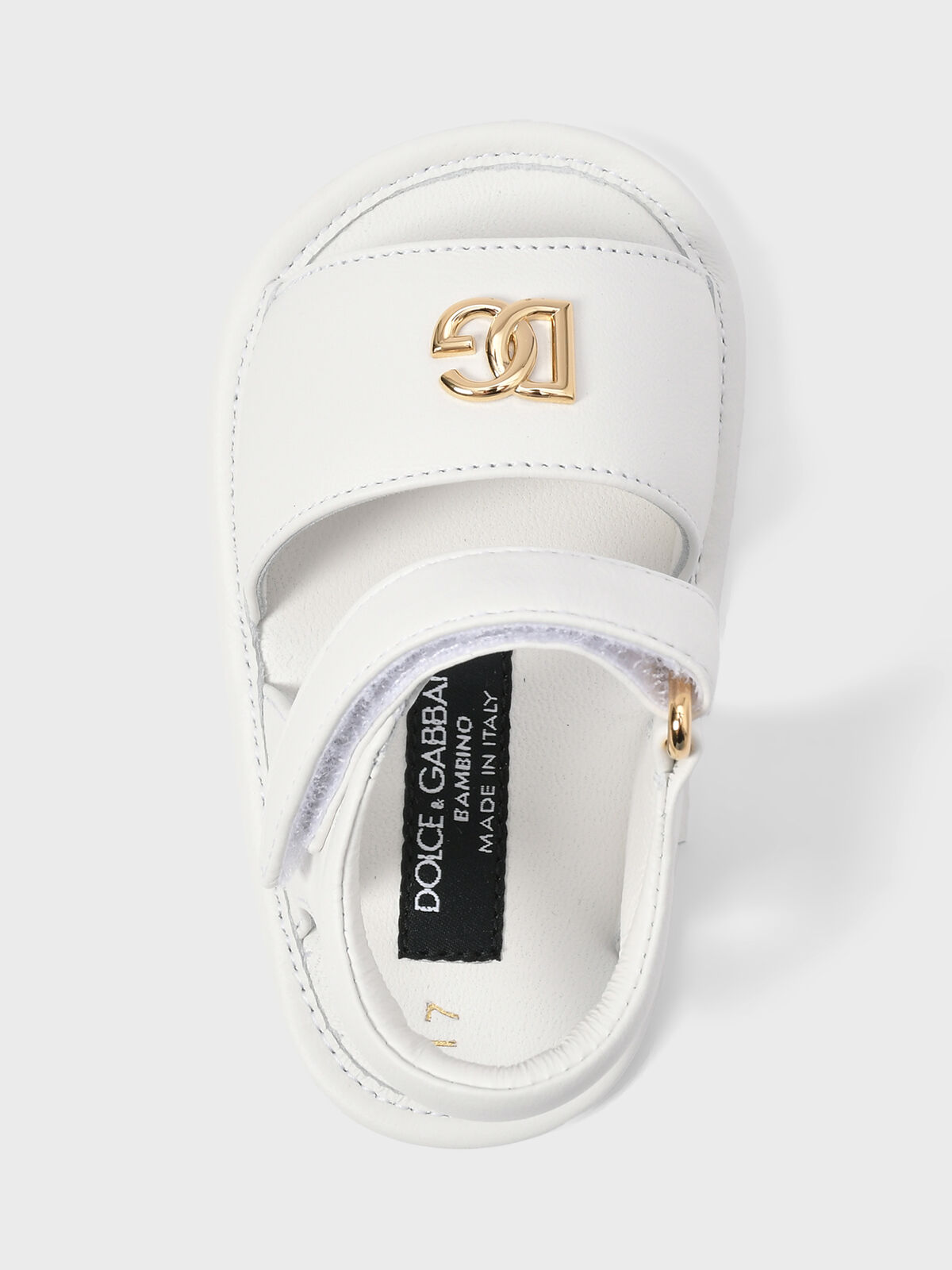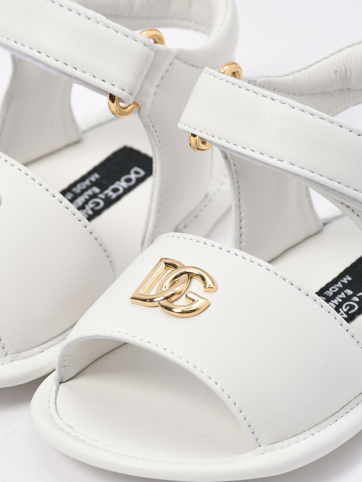 Пинетки-босоножки для новорожденных выполнены из мягкой белой кожи премиум-класса. Модель оснащена удобной застежкой на липучке, которая позволяет плотно зафиксировать обувь на ноге. Пинетки декорированы золотистой монограммой бренда.