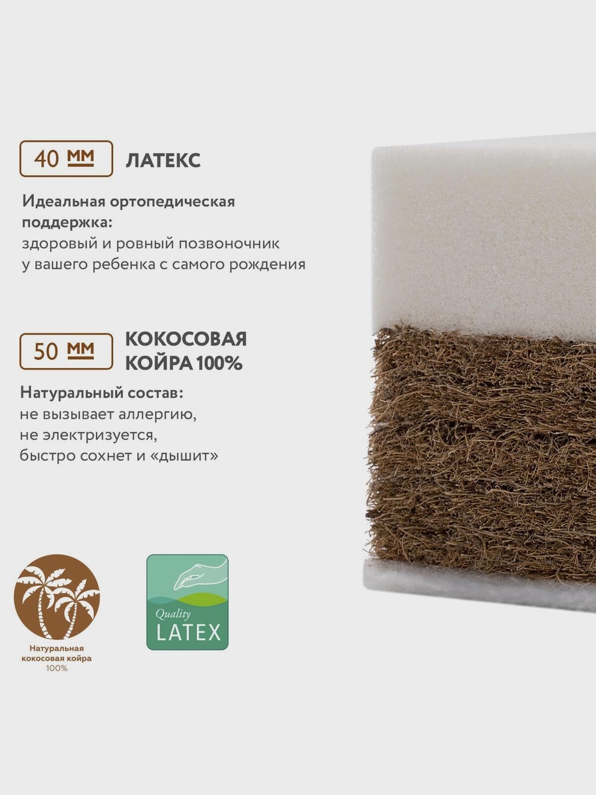 В модели достигается двойной эффект благодаря комбинации кокосовой койры и натурального латекса. На стороне с латексом ребенку будет комфортно спать, точечное распределение веса позволит расслабиться каждой мышце тела и по-настоящему отдохнуть. 100% натуральная кокосовая койра с другой стороны матраса обеспечит ровную поверхность во время сна и позаботится о будущей осанке малыша.