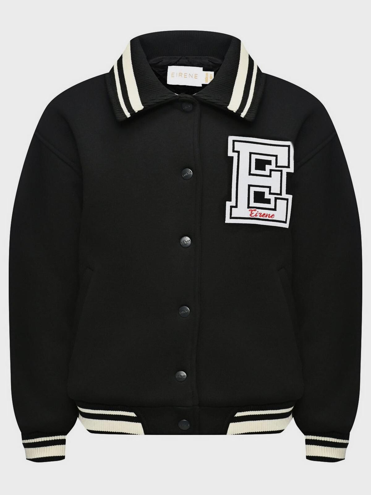 Стильный черный бомбер Eirene для девочек. Классический крой, объемные рукава, отложной воротник, резинки в полоску на манжетах и по низу изделия. Застегивается на брендированные кнопки, что делает процесс надевания и снятия одежды максимально комфортным. Декор в виде фирменного лого слева на груди и крупная надпись-вышивка на спине подчеркивают индивидуальность и стиль.