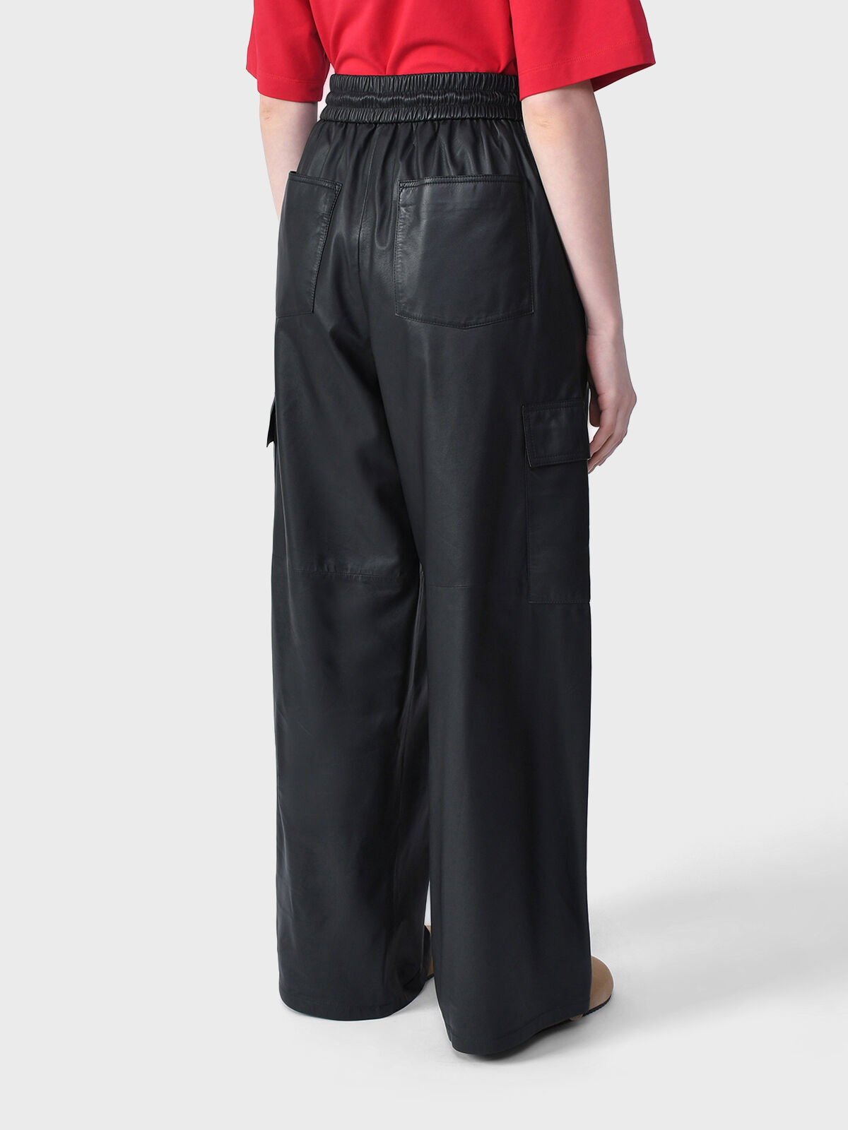 Черные брюки Yves Salomon изготовлены из тонкой кожи ягненка. Благодаря широкому крою и высокой посадке на талии модель визуально вытягивает силуэт и помогает сделать образ одновременно женственным и расслабленным. Спереди расположены два прорезных кармана, сзади – два накладных, а по бокам еще два карго. Эластичный пояс дополнен утягивающим шнурком.