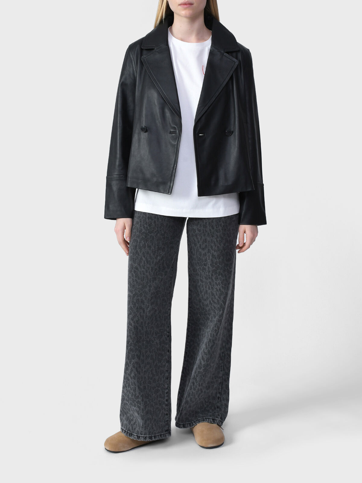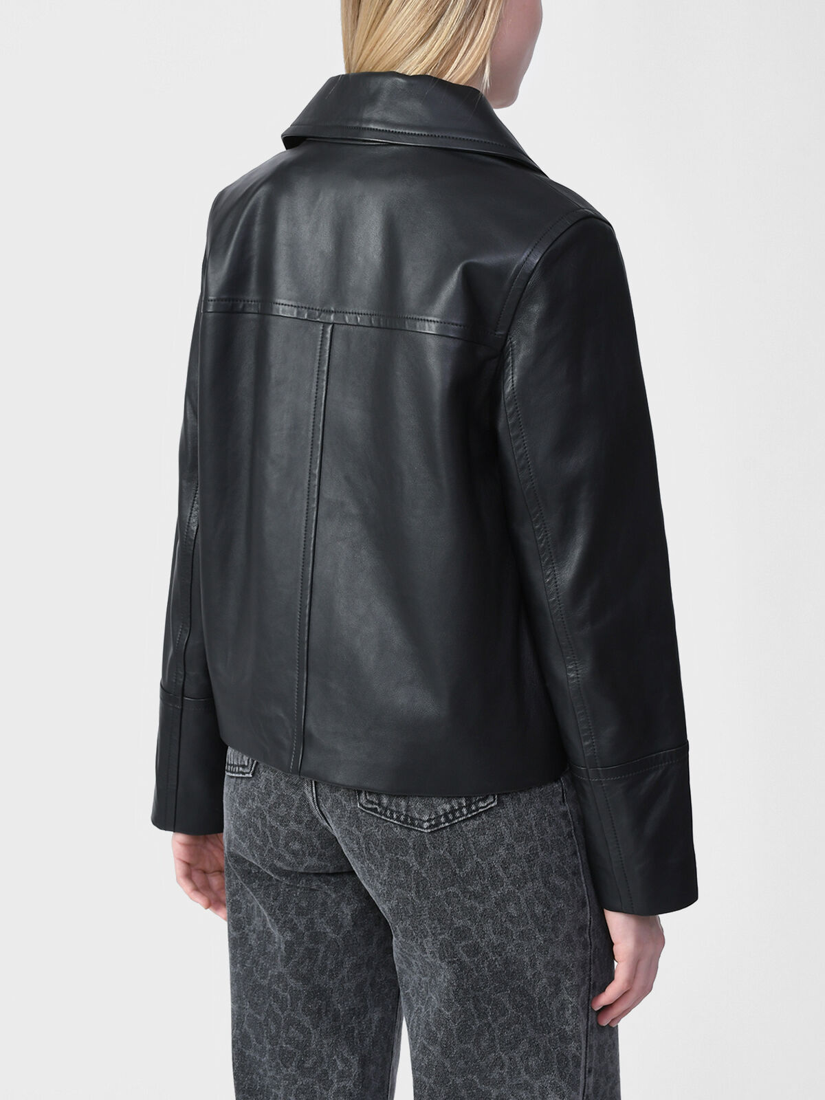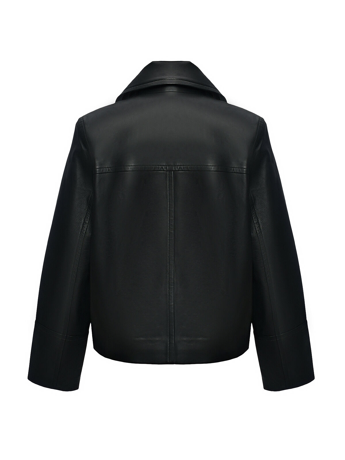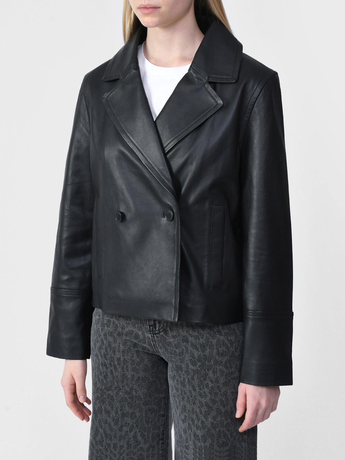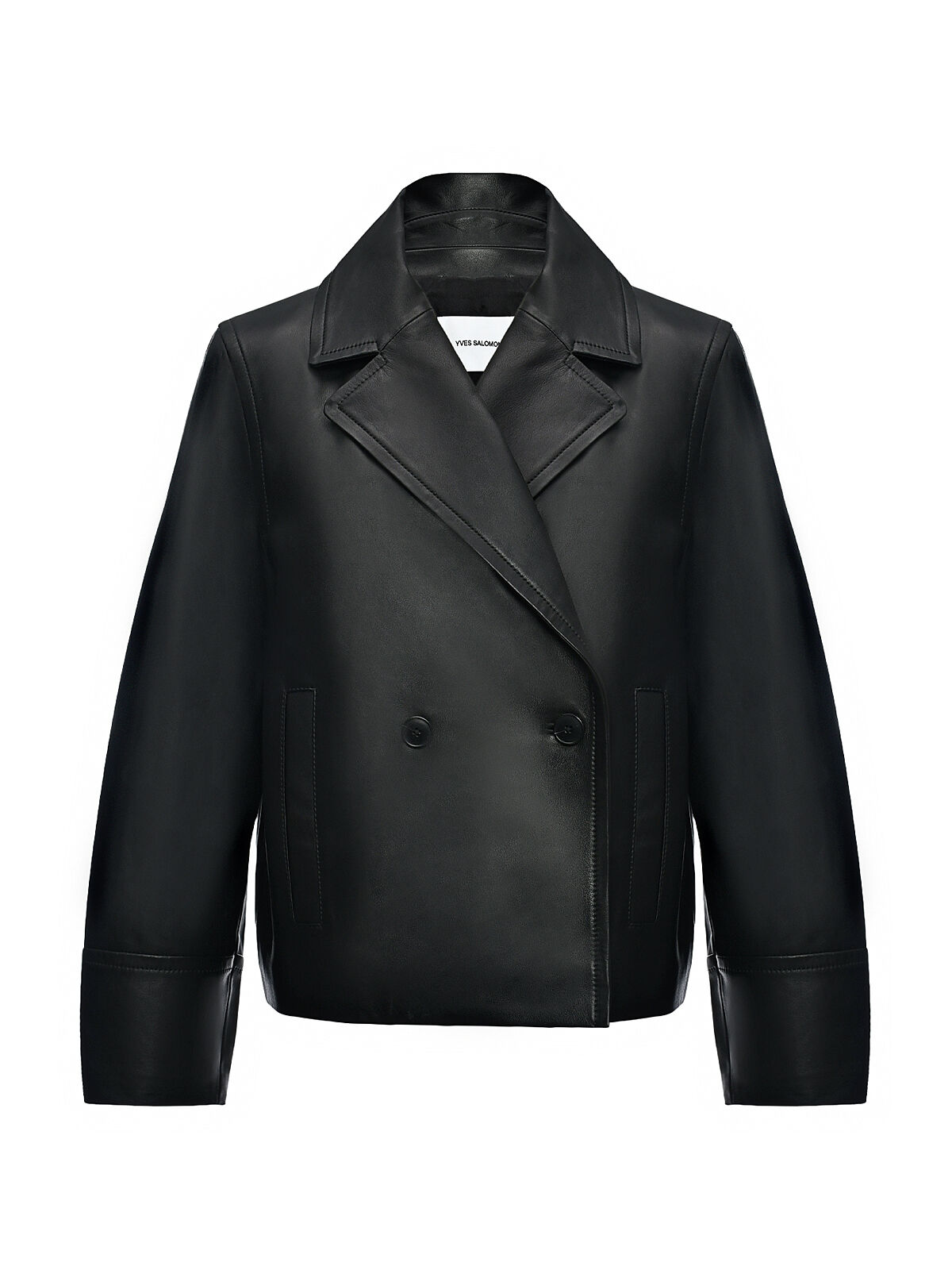 Двубортная куртка Yves Salomon выполнена из гладкой черной кожи. Тонко выделанный материал комфортно садится по фигуре, хорошо защищает от ветра и влаги, а благодаря пористой структуре хорошо дышит. Модель с небольшим V-образным вырезом и широкими лацканами застегивается на пуговицы. По бокам расположены два прорезных кармана.