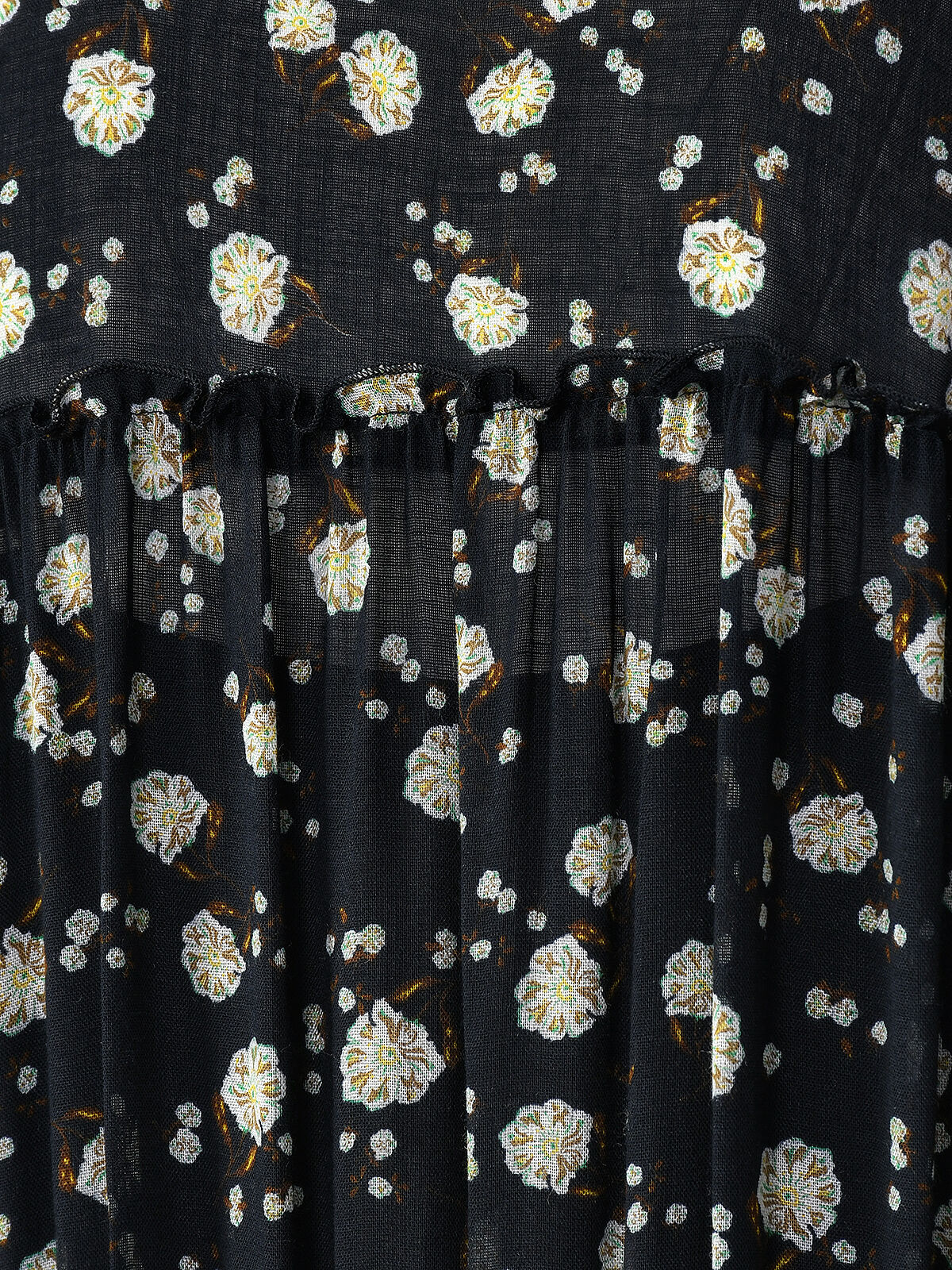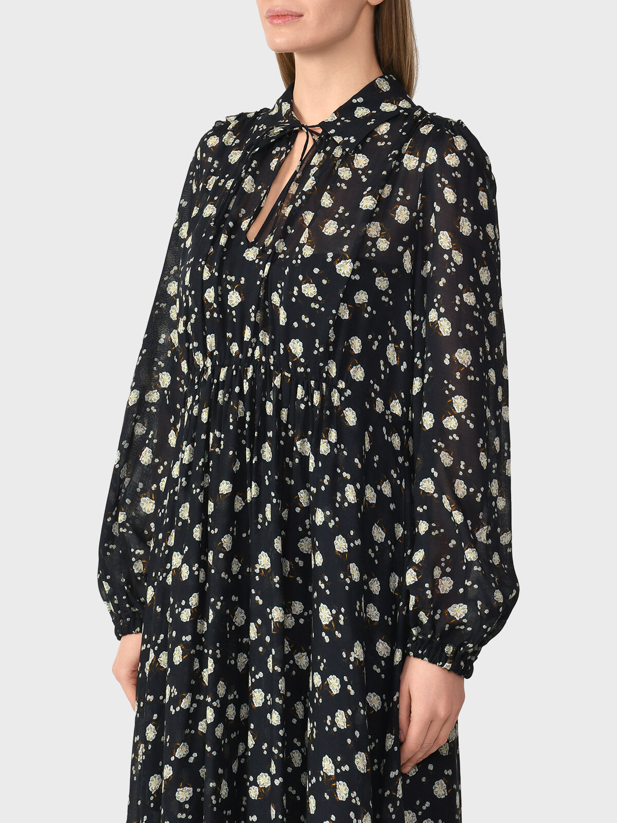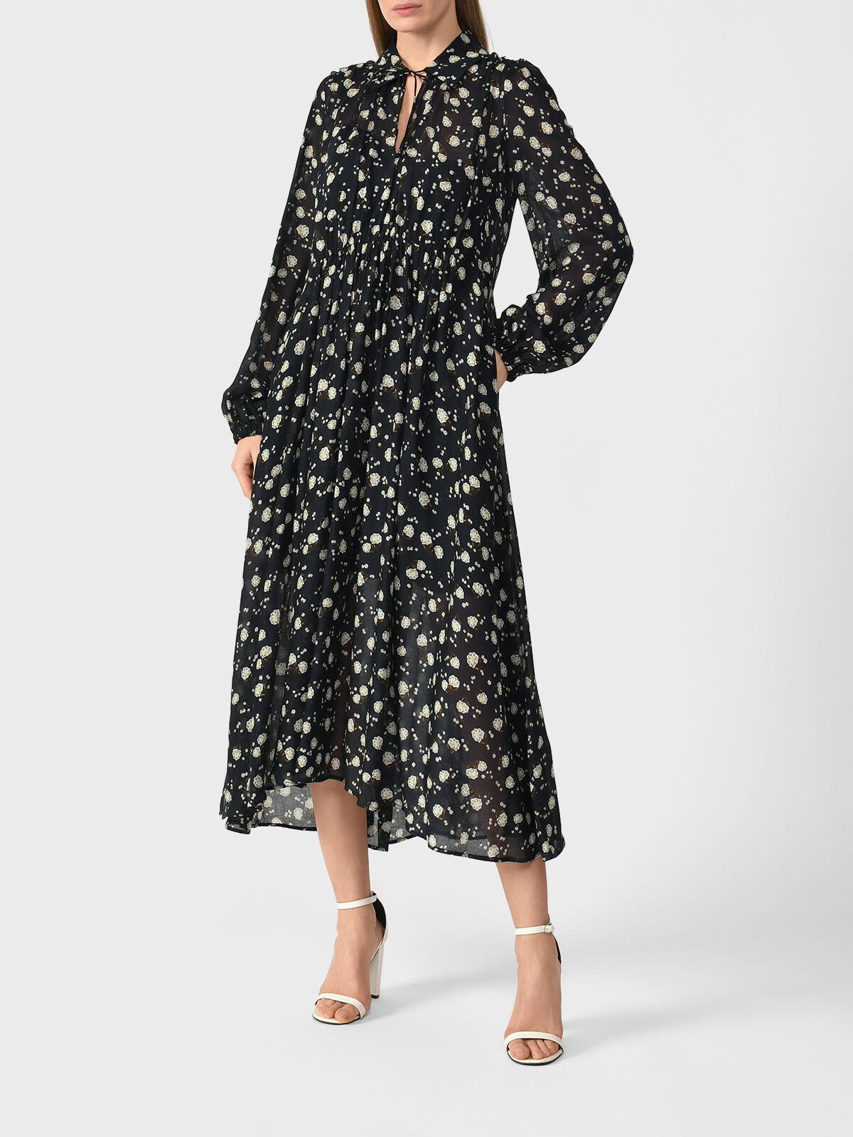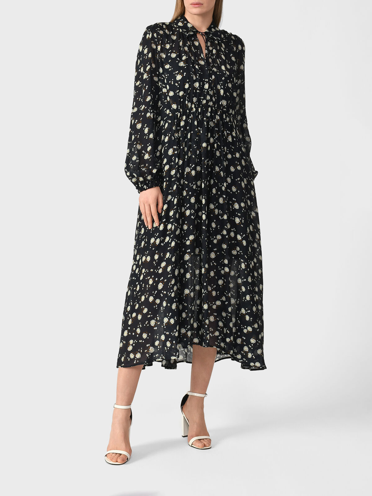 Темно-синее платье с цветочным принтом — это идеальное сочетание элегантности и комфорта. Сшитое из вискозы с добавлением шерсти, оно сочетает в себе легкость и уют. Пуговицы придают ему винтажный шарм, а цветочный принт добавляет свежести и яркости. Это платье идеально подходит для стильных образов в духе ретро, бохо или романтического casual. Можно сочетать его с уютным кардиганом и ботильонами для создания расслабленного образа.